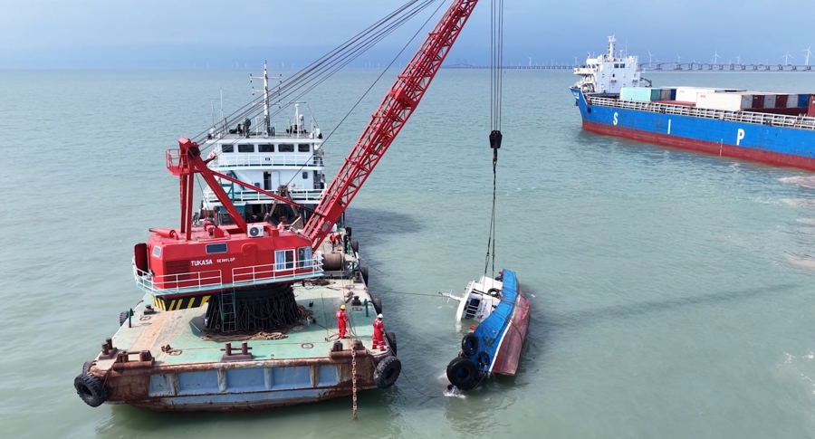 针对渔船翻扣后“舱内空间狭小、结构复杂、能见度低、随时可能沉没”的高风险场景,专业潜水员携带水下呼吸器、破拆工具及定位设备,精准评估船体稳定性后潜入舱内,成功定位并解救被困船员。该科目填补了“翻扣渔船内部救援”的实战空白,检验了潜水队伍的技术能力与应急处置流程,为同类险情救援提供了关键经验。