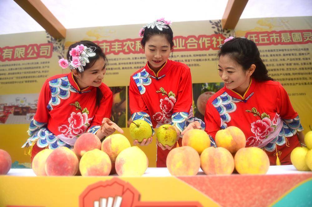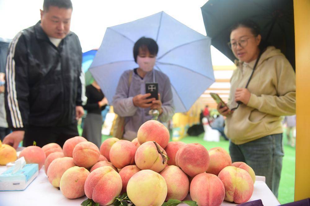 参观者在农产品展示区了解新品种桃子。傅新春摄